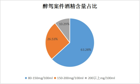 (二)重度醉驾案件占比较大。2021年至2023年办理的554起“醉驾型”危险驾驶案件中,酒精含量在150-200mg/100ml的有147人,占比26.53%;200mg/100ml以上的有57人,占比10.29%。重度醉驾案件占比超过三分之一,交通肇事风险大。